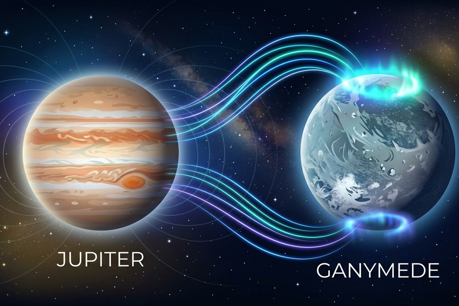 Ganymede's northern and southern auroras take turns being the brightest, powered by invisible magnetic collisions with Jupiter's plasma.